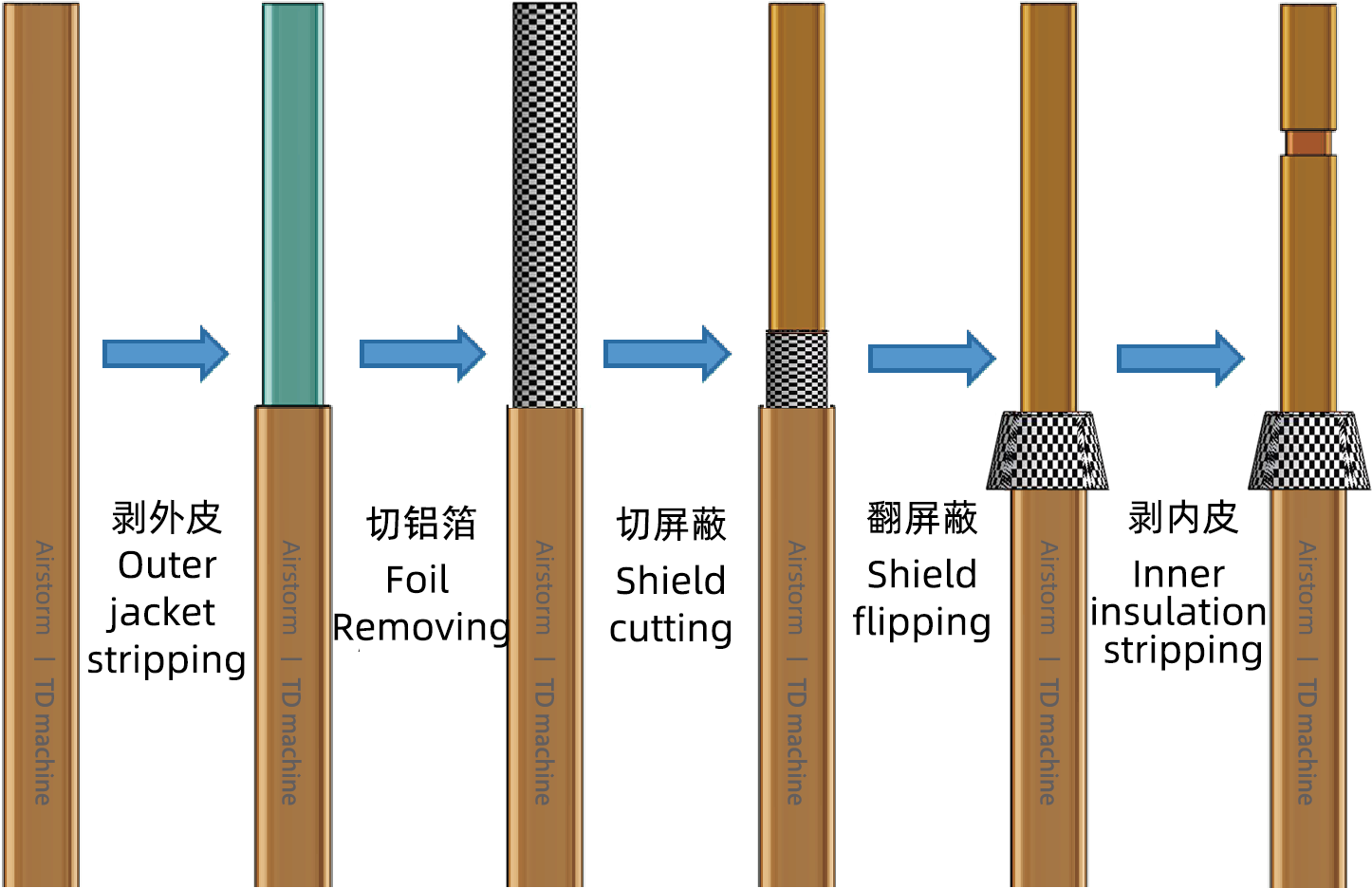 HSC800設(shè)備應(yīng)用于新能源高壓同軸線的加工,可實(shí)現(xiàn)多達(dá)7種功能:剝外絕緣皮,切鋁箔,切屏蔽網(wǎng),翻屏蔽網(wǎng),屏蔽網(wǎng)刷直(-7),屏蔽網(wǎng)二次切斷(-7),剝內(nèi)皮(亦可半剝)。它是一臺(tái)半自動(dòng)機(jī),操作簡單,人機(jī)界面友好。每個(gè)功能單元均可獨(dú)立打開可關(guān)閉,比如也可以加工沒有鋁箔層的線束。HSC800實(shí)現(xiàn)了原來需7個(gè)手工工序完成的工藝,變成只有一個(gè)步驟的全自動(dòng)工序,大大提高了生產(chǎn)效率和品質(zhì)是性價(jià)比很高的解決方案。